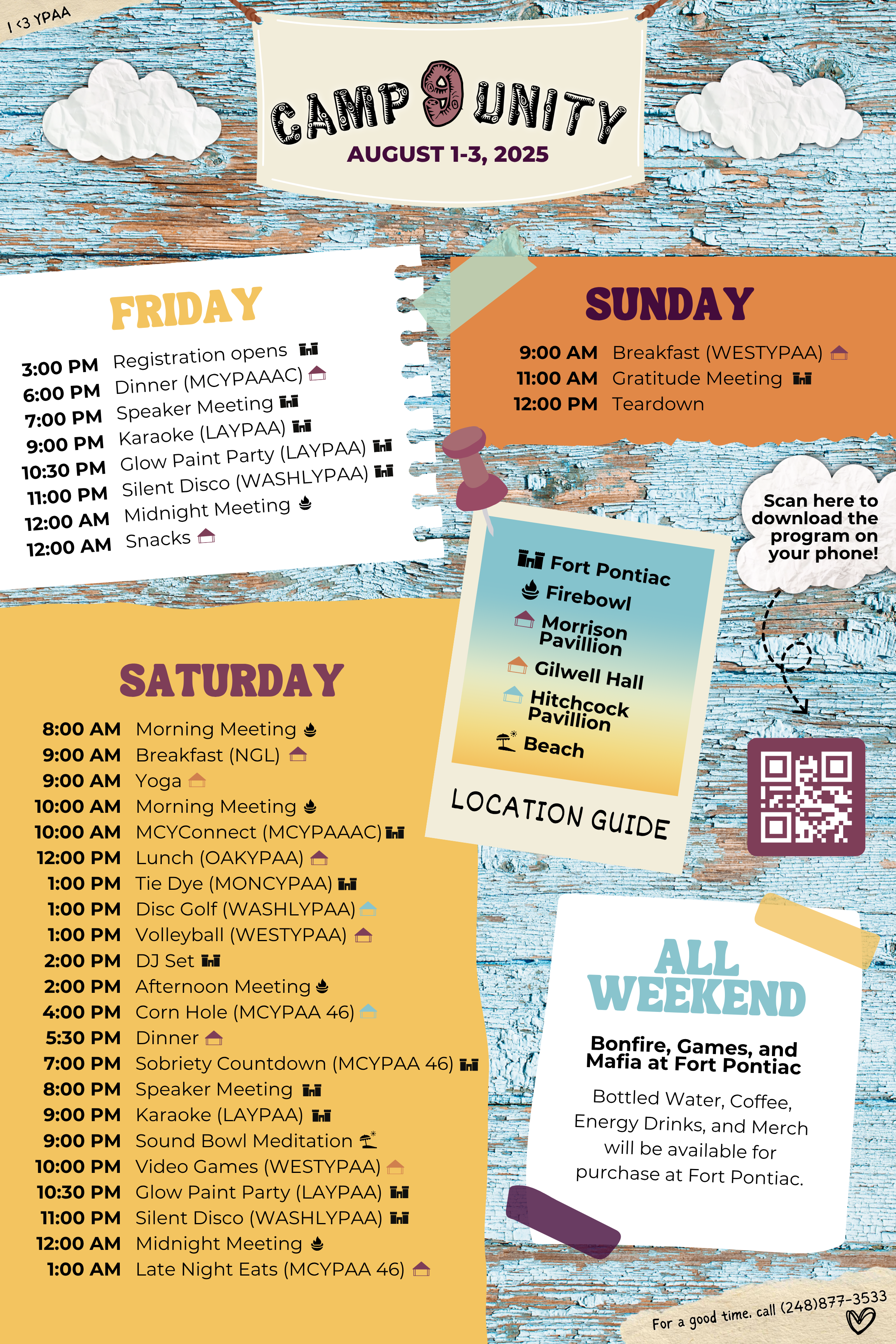 This weekend-long event runs from Friday afternoon through Sunday morning, offering connection, fun, and fellowship in a substance-free environment.